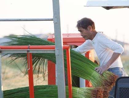 毎朝田んぼに向かい、い草の状態を触って確認しています。上質ない草を育てるため一つ一つの作業を丁寧に行っています。特に畳表を織る前のい草の選別を念入りにし、傷のない綺麗な畳表に仕上げています。